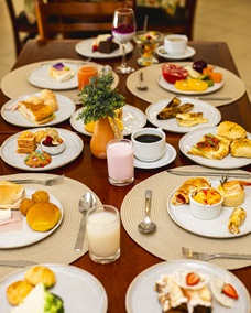 Café da manhã incluso em sua hospedagem com uma seleção cuidadosa de delícias que prometem encantar.